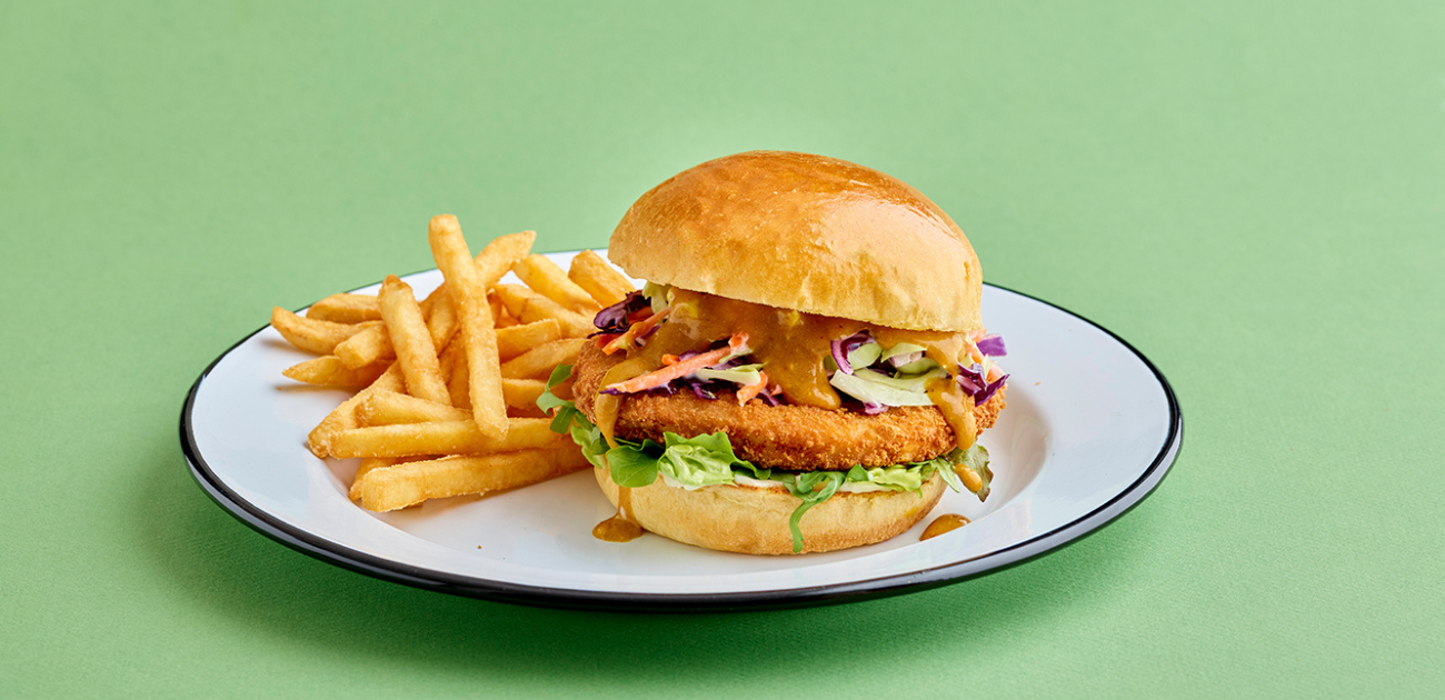 This simple burger build takes a classic chicken, mayo, and lettuce concept to the next level by simply adding a Katsu curry sauce and ‘slaw. Inspired by the current popular Asian katsu curry market trends, this simple ingredient gives your dish a premium edge that you can in turn charge a premium price for.