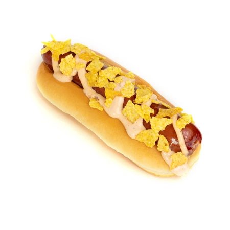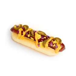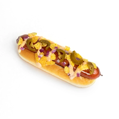 3. Place hot dog in the bun and top with the with crushed nachos diced onion and pickled jalapenos.